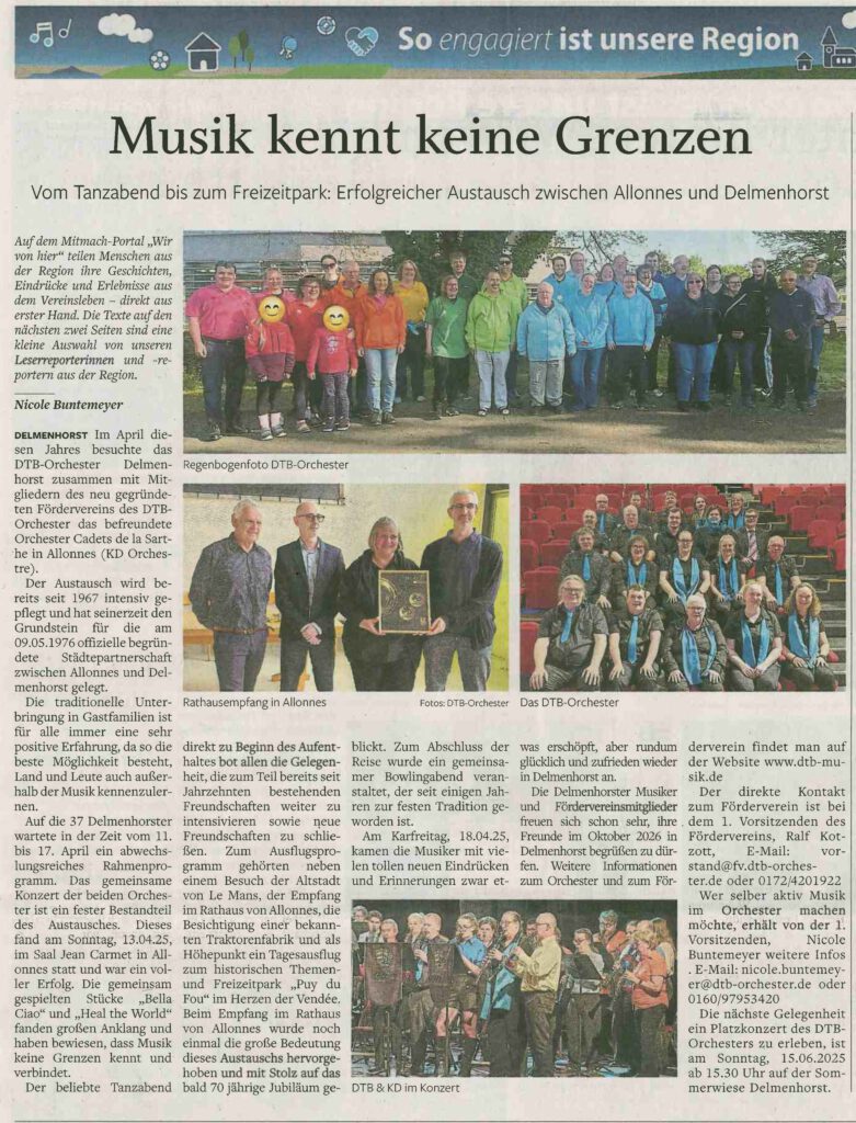 Im April 2025 hat sich das DTB Orchester Delmenhorst auf den Weg in die Partnerstadt zum befreundeten Orchester KD gemacht. Mit rund 30 Teilnehmern wurde eine erlebnisreiche Woche erlebt. Das besondere bei den Musikern – alle übernachten in Gastfamilien. Viele Musiker kennen sich bereits seit Jahrzehnten und es sind tiefe Freundschaften entstanden.